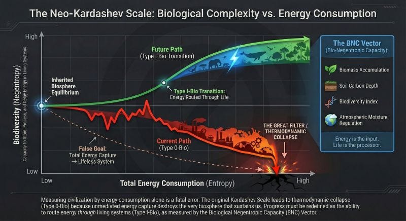 On it, as the diagram below shows, “we’re currently Type 0-Bio: burning through inherited biological capital. The original Kardashev trajectory points toward thermodynamic collapse - one candidate for Fermi’s Great Filter. The alternative is Type I-Bio: measuring advancement by our capacity to route energy through living systems rather than around them. Not just GDP, but Soil Carbon Depth, Biodiversity Index, and Ecosystem Function.”